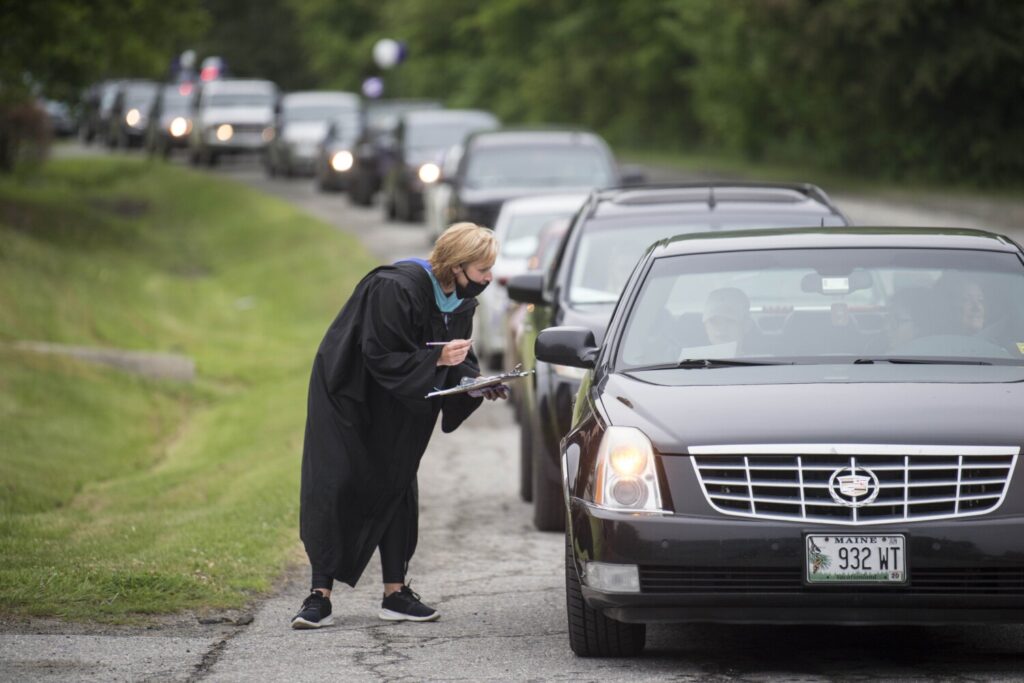 Heather Blanchet guides graduates to their place in line in their personal cars at Waterville Senior High School in Waterville on Thursday, June 11, 2020. (Morning Sentinel photo by Michael G. Seamans/Staff Photographer)