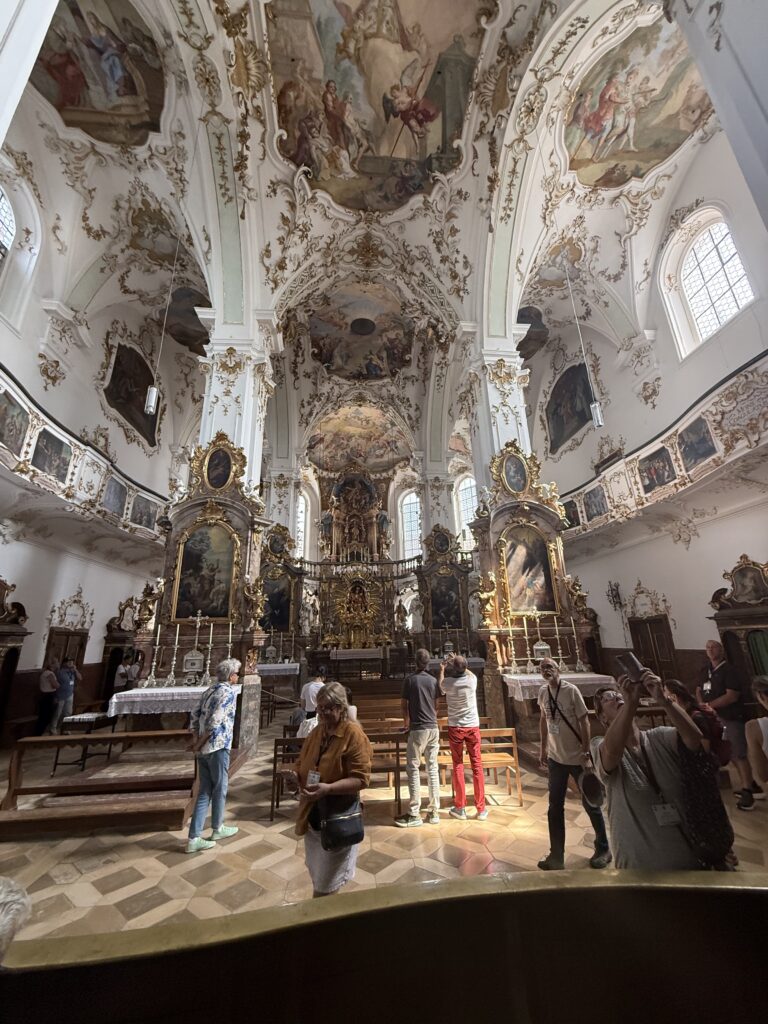 Füssen, home to Ludwig’s famed Neuschwanstein Castle is an historic burg surrounded by the Bavarian alps. Here hot air balloons and paragliders dot the sky beside the craggy peaks. The castle, you may know, was the inspiration for Disneyland’s Magic Kingdom. So it’s definitely very overrun with tourists. We skipped the lines and drove 60 miles to the lesser known Lindenhof Castle which was based on France’s Versailles. Here we toured the beautiful mansion and gardens at our leisure with very little tour-bus culture. Other activities included a hike through the mountains, and the requisite visit to a monastery. After three nights we drove off to Passau on the Danube River.