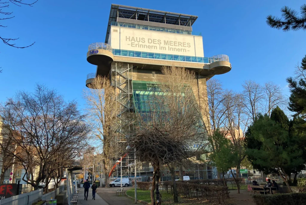 Continue through the architecturally beautiful residential lanes to discover one of Vienna’s most unique venues: The Haus des Meeres. This massive concrete structure was originally constructed as a flak tower to defend the city from allied air assaults during WWII. Because it proved too sturdy to destroy, it has been repurposed as an aquarium, and petite zoo. The ten levels of the tower have no trouble supporting the heavy salt water aquarium tanks, and the miniature Australian outback. Mind the birds which fly freely through the space.