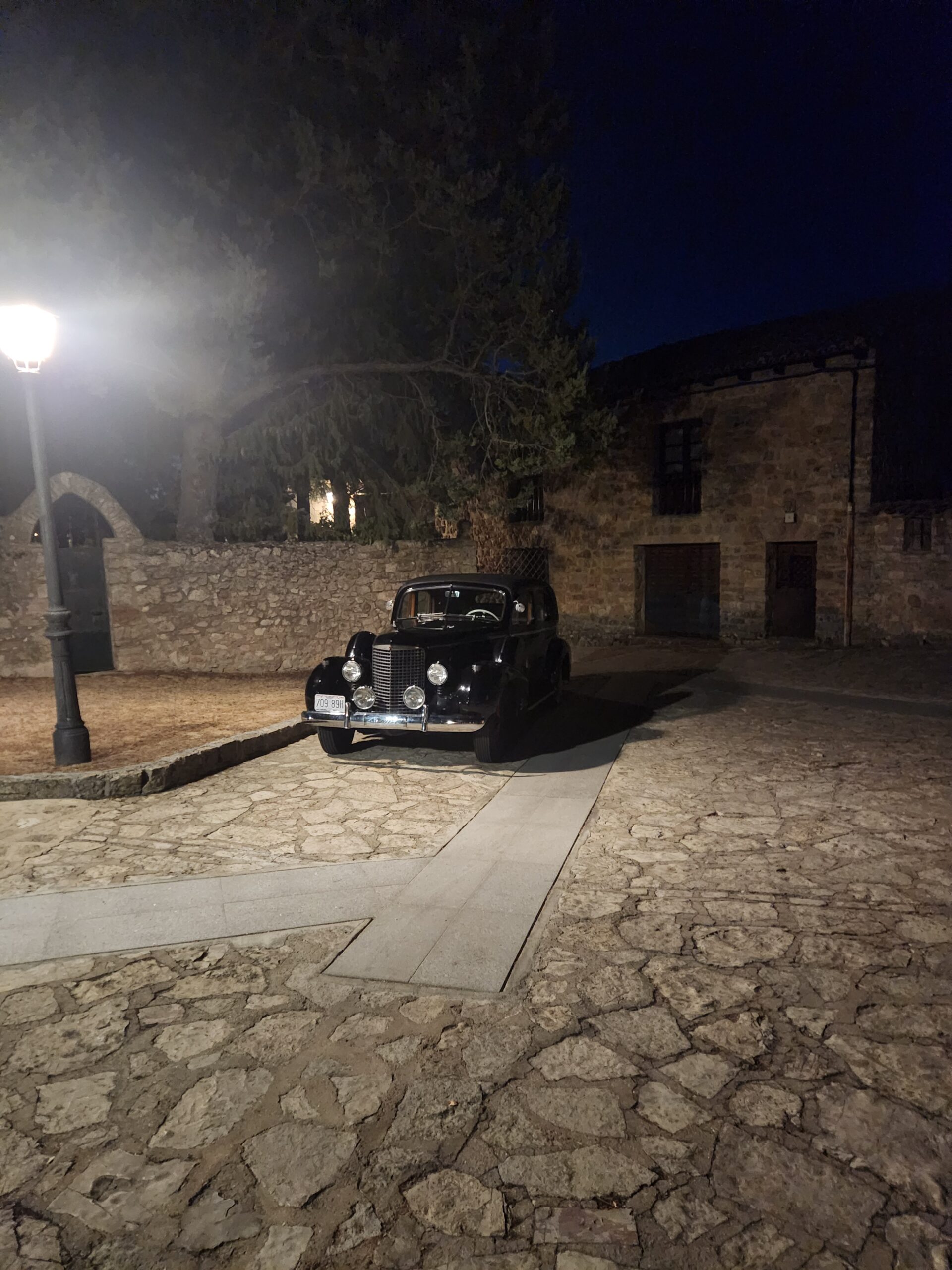 I had originally planned to cross the Iberian peninsula driving two days, but I had second thoughts, and added a stop in Zaragoza. Driver and passenger fatigue was certainly part of the reason. Day after day in the hot old car can tire out the crew. A nice modern, air-conditioned autoroute hostelry would be just the ticket. Also, Guy had developed a thump, thump, thump at highway speeds which emanated from the left front. The noise/vibration appeared to be at wheel rotation speed, so mentally I ran down the list: bearing, wheel, tire, brake? In any case, it would need attention. Our Zaragoza motel had a comfortable covered parking area, so I got the left front corner jacked up and gave the wheel a spin. The bearing was smooth, the brake did not drag, and the wheel ran true. The tire, however, had a knot in it the size of my fist. Changing the wheel was no big deal. The spare tire, of course, was not a 4-inch wide white, but a utilitarian black wall. To make matters worse, the spare wheel could not accommodate the wheel cover. I hoped a neighborhood tire store could swap the back wall onto the whitewall’s wheel so we could at least roll with the wheel cover, but alas my best high-school Spanish couldn’t convince the tire shop to complete the task. I suppose there are worse things than driving across Spain with only three whitewalls.